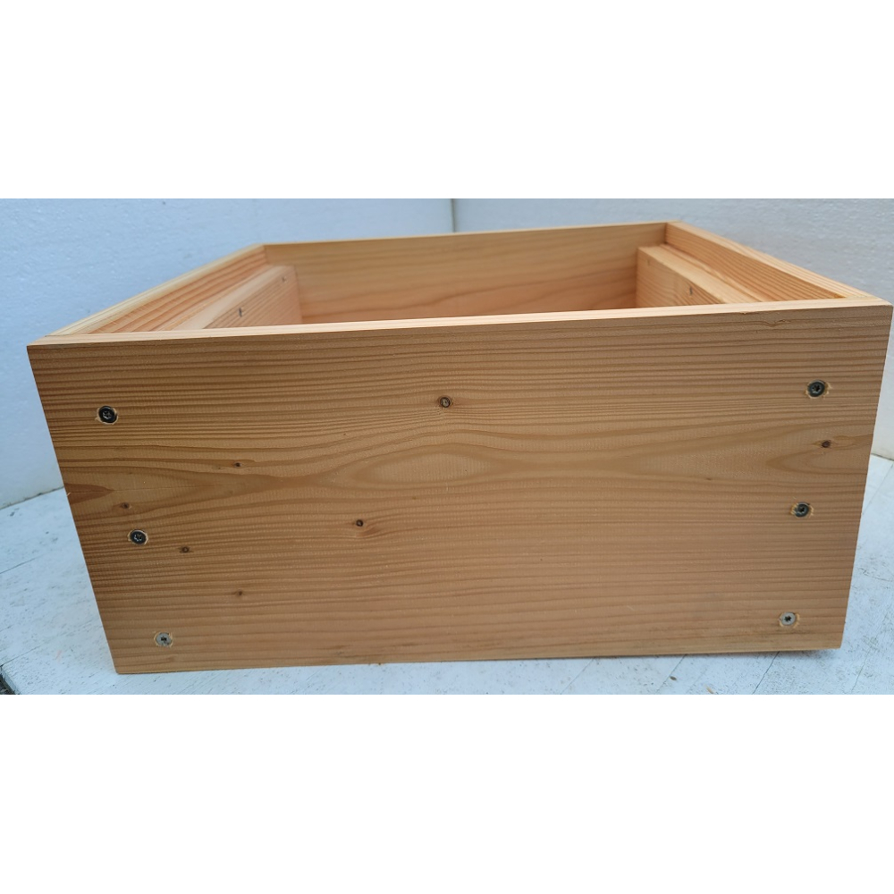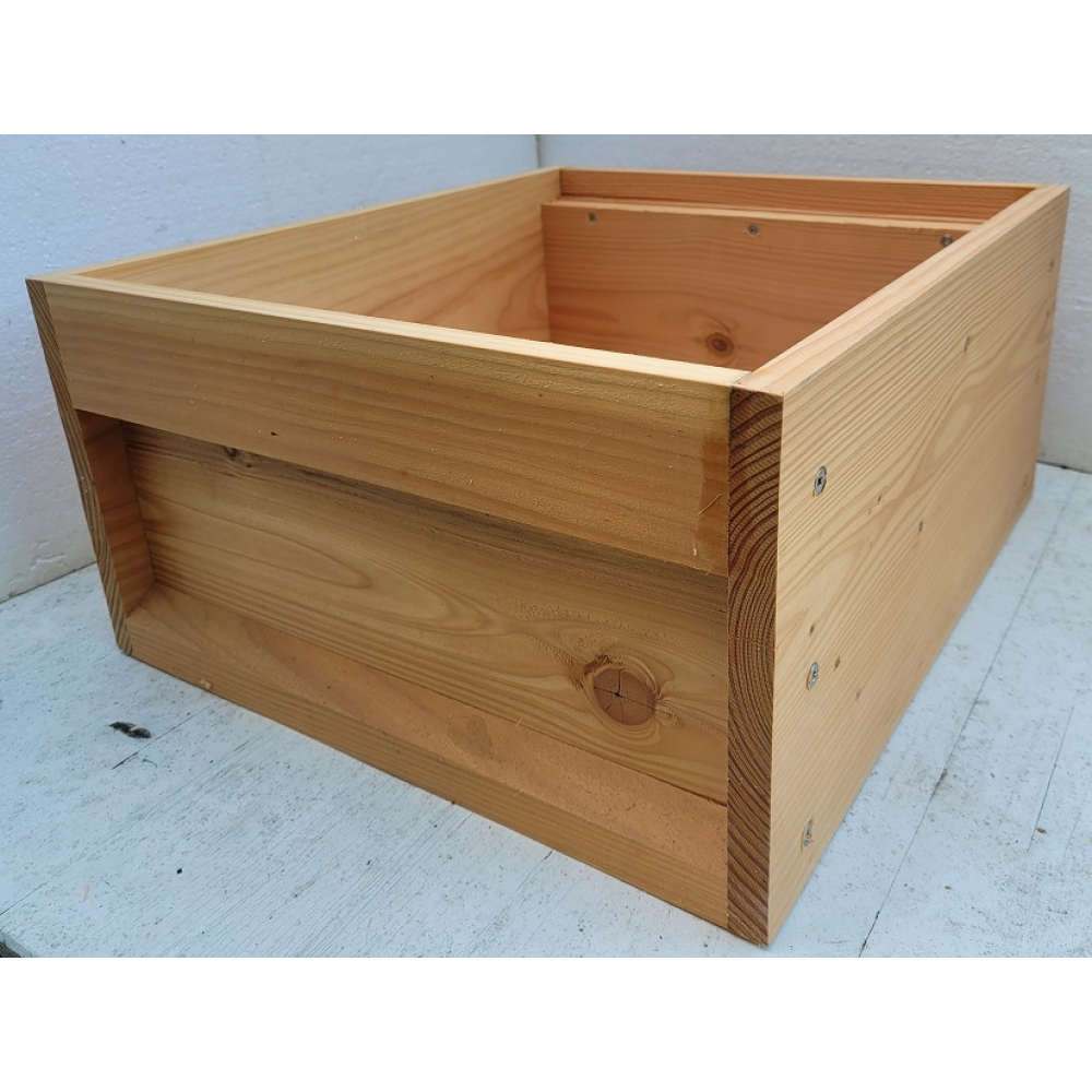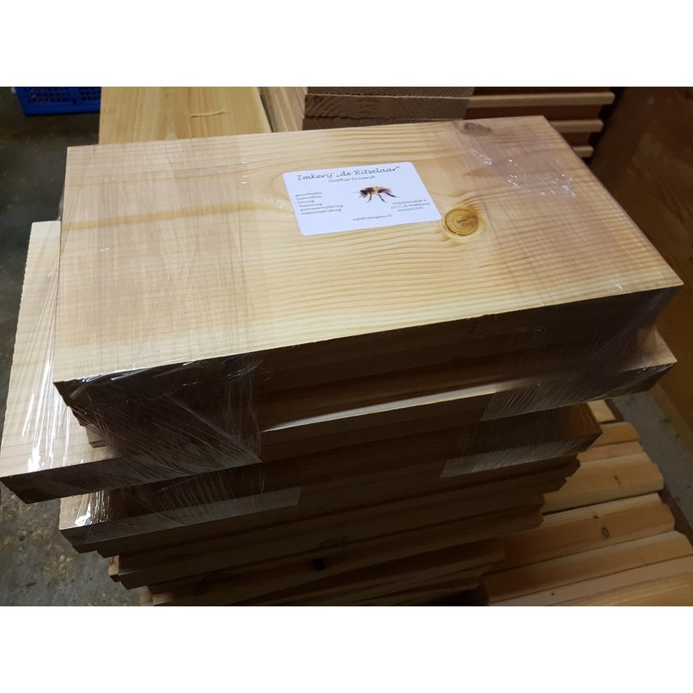 Deze broedkamers zijn gemaakt van douglas hout, onderdelen reeds op maat afgekort. De zijwanden zijn 1-zijdig geschaafd naar ca 18 mm, de voor- en achterwand 1-zijdig geschaafd naar 24 mm. De kasten zijn onbehandeld. Douglas staat erom bekend dat het onbehandeld (boven de grond) buiten toegepast mag worden.